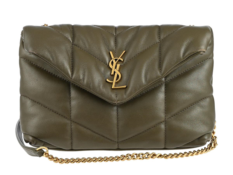 SAINT LAURENT, VÄSKA, Mini Puffer Toy, grönt lammskinn, guldfärgade beslag, 22x13x6 cm, originalkvitto från 2021, cert, dustbag, originalkartong, slitage på hörn. Good Condition.