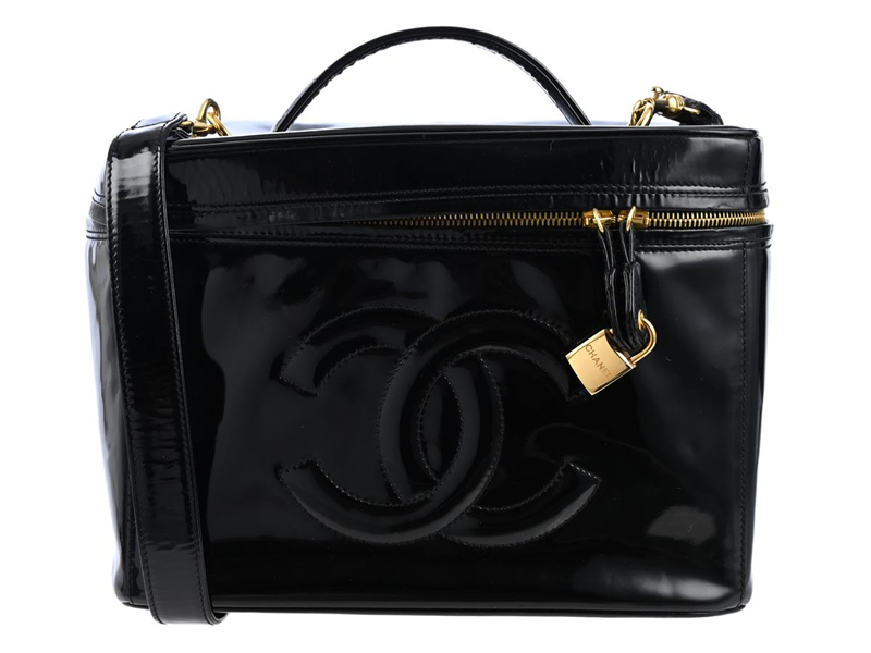 CHANEL, VÄSKA, Vintage Large Vanity Case Bag, svart patent läder, guldfärgade beslag, 27x18x20 cm, hologrammärkt 4494917, år 1996-1997, avtagbar axelrem, cert, clochette, hänglås och nycklar, care booklet. Very Good Condition.