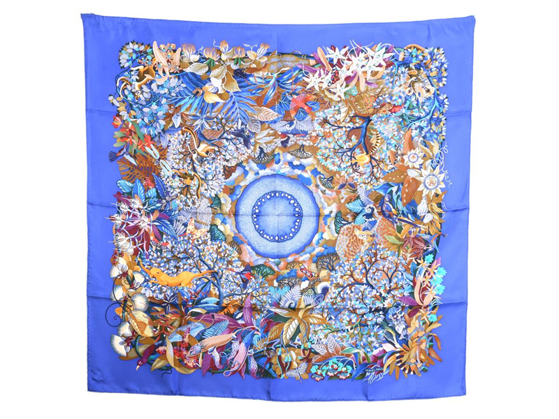 HERMÈS, SCARF, At the Heart of Life, Aline Honoré, 100% siden, 90x90 cm, multifärgad, blå, lila, grön, originalask. Excellent Condition.