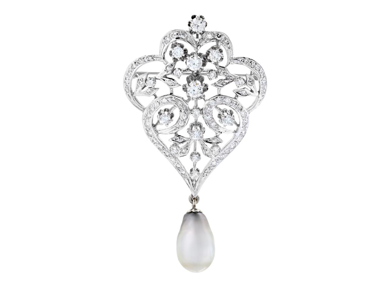 BROSCH/HÄNGE, 14K vitguld, odlad pärla ca 16x10 mm, briljant- och åttkantslipade diamanter ca 2,30 ctv, höjd 67 mm, vikt 14,4 g, några diamanter har nagg och små skador.
