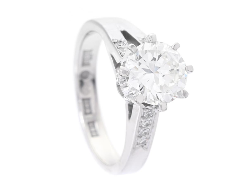 ENSTENSRING, 18K vitguld, briljantslipad diamant 1,54 ct enligt gravyr, ca W(H)/SI2, 8 åttkantslipade diamanter ca 0,08 ctv, Gabrielsons Guldsmedja, Stockholm 1979, stl 17 mm, vikt 6,2 g, den större diamanten har stort bord, låg krona, kulettfasett samt en skada invid rondisten.