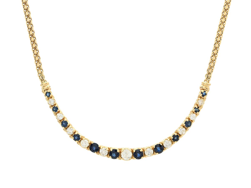 COLLIER, 14K guld, briljantslipade diamanter ca 1,45 ctv, ca TW-W/P1-P2, blå safirer, längd ca 48 cm, 15,4 g.