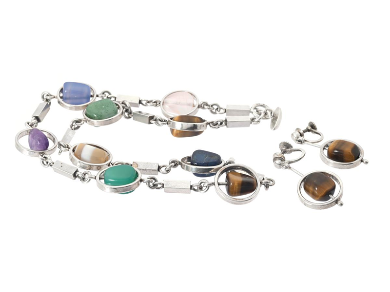 ARVO SAARELA, collier och örhängen, silver, äkta färsgtenar, Enköping 1966, längd 43 cm, skruvmekanism.