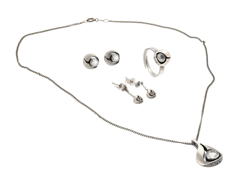 KARL LAINE, Smyckeset, sterlingsilver, fasettslipade bergskristaller, collier, 2 par örhängen, ring, Finland, vikt 12,8 g. originaletui