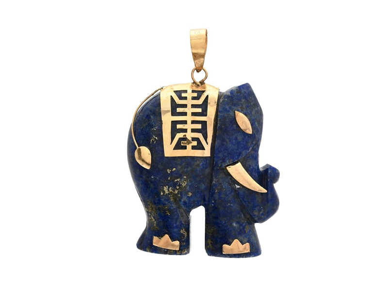HÄNGE, elefant, 14K guld, snidad lapis lazuli, höjd 33 mm, vikt 6,2 g.