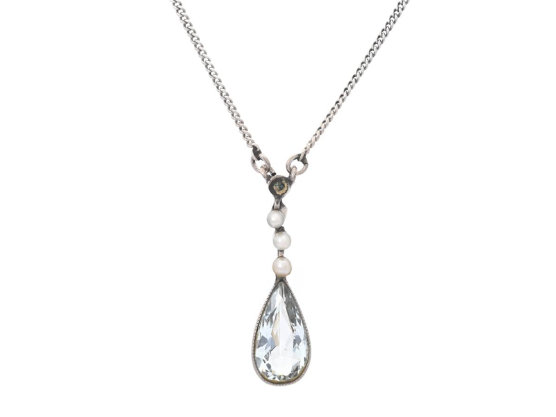 HÄNGE MED KEDJA, silver, pärlor, droppslipad akvamarin, längd 45 cm, höjd på hänge 2,5 cm, vikt 2,9 g, en pärla saknas.