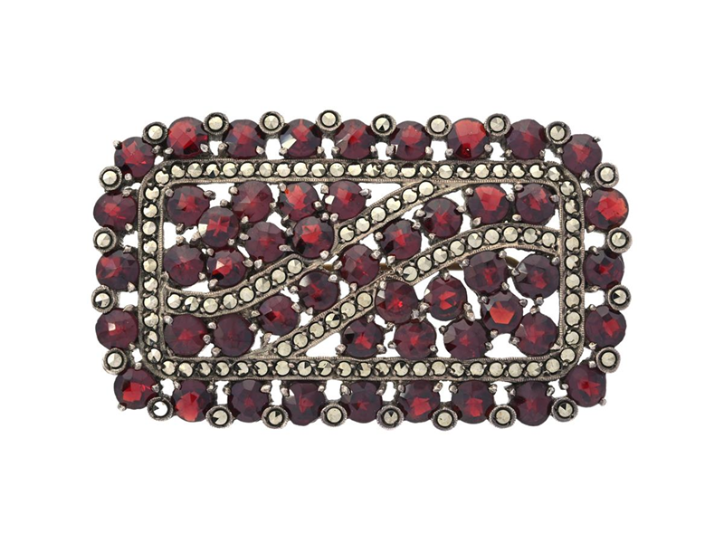 BROSCH, silver, granater, markasiter, mått 50x30 mm, vikt 16,1 g, nål i mässing.