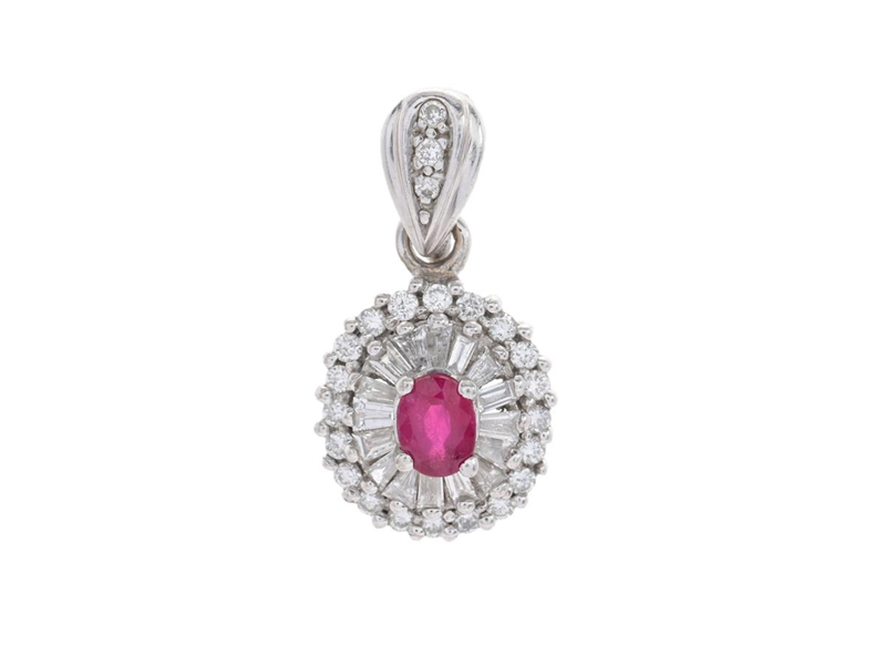 HÄNGE, 18K vitguld, ovalslipad rubin, baguette - och briljantslipade diamanter ca 0,30 ctv, höjd 17 mm, vikt 2,2 g.
