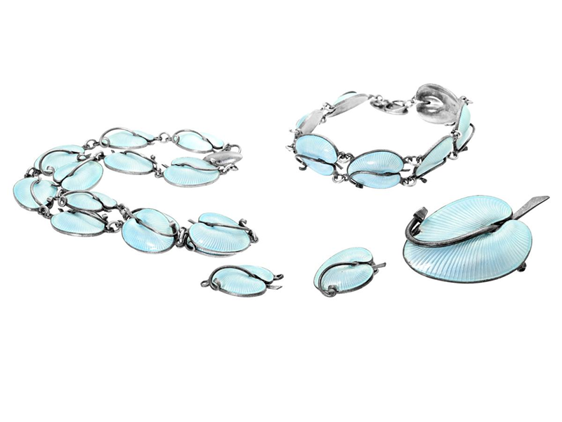 VOLMER BAHNER & CO, smyckeset, collier, armband, brosch, ett enstaka örhänge clips, sterlingsilver, emalj, Danmark, extra länkbit till collier, längd collier 36 cm, längd armband 17 cm, brosch 5x3,5 cm, vikt 81,5 gram. extra länkbit medföljer, ett örhängen saknas