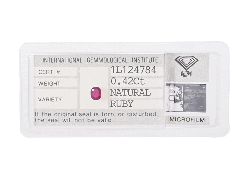 RUBIN, 0,42 ct, mått 4,8 x 3,9 x 2,1 mm, IGI certifikat 1L124784, förseglat.