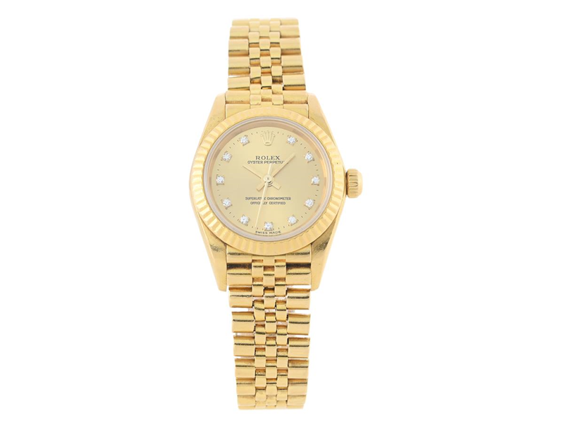 ROLEX, Oyster Perpetual, Chronometer, Ref nr. 76198, Serie nr. Y218233, Cal 2230, Verk nr. A 0780115, Boett nr. 2038, damur, 25 mm, 18K guld, automatisk, safirglas (nagg/repor), diamanturtavla (11 st. 8/8), Jubileelänk, viklås, Ref nr. 8571/91, totalvikt 69,5 gram, ca 2002.