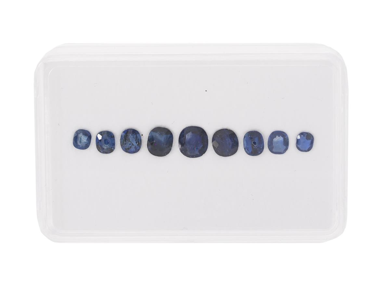 9 SAFIRER, kuddslipade, 4,13 ctv, ca 3,8x3,1-6,1x5,5 mm, flera har nagg och inneslutningar som når ytan.