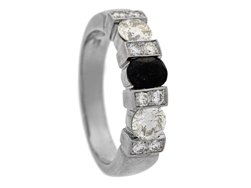 RING, 18K vitguld, oval safir, 10 briljantslipade diamanter ca 0,80 ctv, ca W-Ca/SI, storlek 17 mm, vikt 7,0 g.