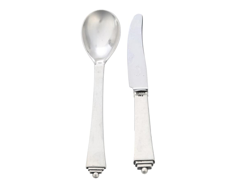 GEORG JENSEN, sked & liten kniv, Pyramid, sterlingsilver och blad i rostfritt stål, Design Harald Nielsen,