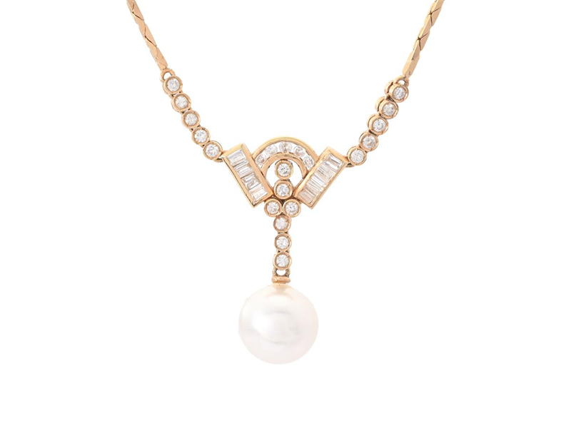 COLLIER, 18K guld, imitationspärla, 22 briljant - och 8 baguetteslipade diamanter ca 0,70 ctv, längd 41 cm, 9,7 g.