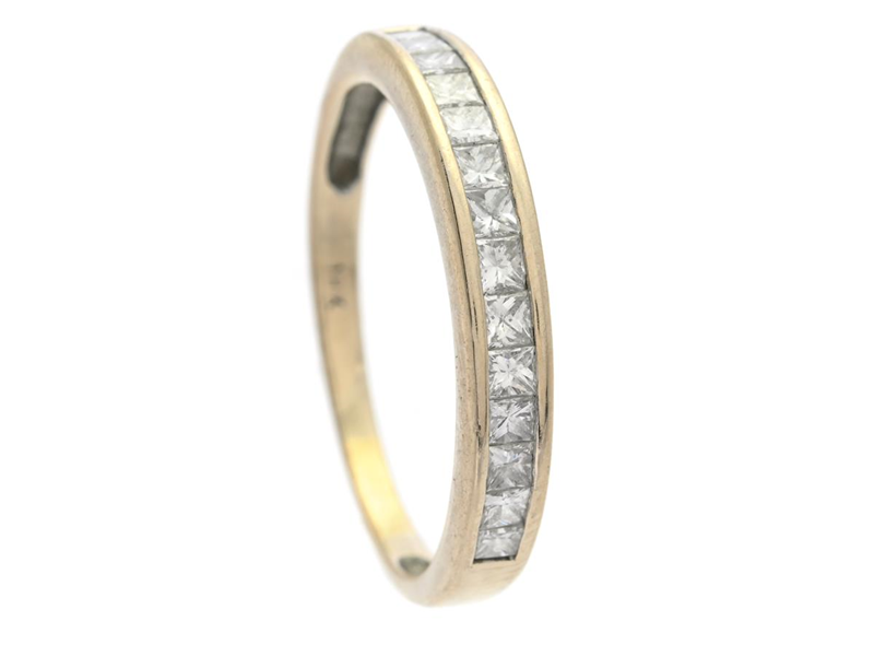 ALLIANSRING, rodinerat 18K guld, 14 prinsesslipade diamanter ca 0,55 ctv, stl 18,75 mm, vikt 2,9 g, mindre nagg hos diamanterna.
