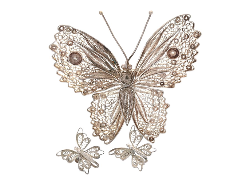 SMYCKESSET, brosch, örhängen, sterlingsilver, fjärilar, mått 8 x 8,5 cm, 2 x 2 mm, vikt 27,9 g, skruvlås, ett örhänge är skevt, ett spröt på fjärilen är skevt.