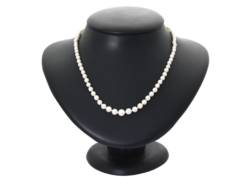 PÄRLCOLLIER, odlade doserade pärlor ca 2,5-6,5 mm, lås i 18K vitguld med CZ, längd 48 cm, vikt 11,2 g, knutet.