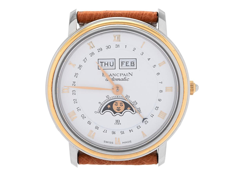 BLANCPAIN, Villerét, "Triple Calendar Moonphase", Cal 6595, Boett nr. 1367, herrur, 34 mm, stål/guld, automatisk, safirglas (nagg), dag, datum, månad, månfas, läderband, originalspänne i doublé, ca 1995, etui (ej komplett).