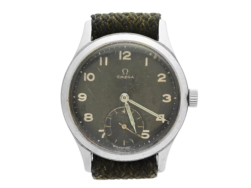 OMEGA, herrur, 35 mm, Cal 265, Serie nr. 12047106, Ref nr. CK 2622, Boett nr. 2622-2, stål, manuell, plexiglas, liten sekundvisare, skadad urtavla (saknar lume), Perlonband, ca 1950.