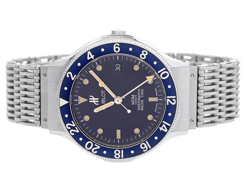 HUBLOT, Geneve, MDM, Greenwich Mean Time, Serie nr. 254456, Boett nr. 1572.1, herrur, 36 mm, stål, quartz, safirglas, datum, 24-timmarsvisning, integrerad originallänk, viklås, ca 1995.