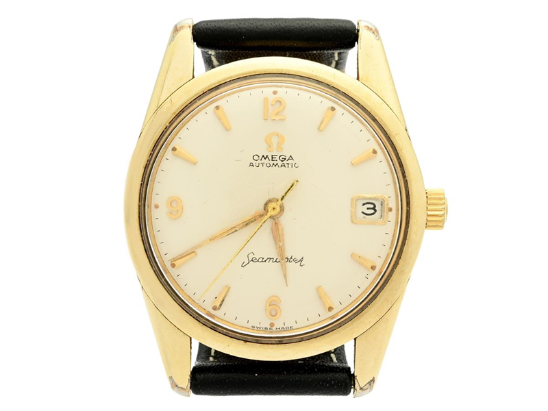 OMEGA, Seamaster, Cal 562, Serie nr. 18007274, Ref nr. KO 14701, Boett nr. 14701 4 SC (C.B), herrur, 33,5 mm, guld på stål (skadad), automatisk, plexiglas, datum, skadad urtavla, läderband, ca 1961.