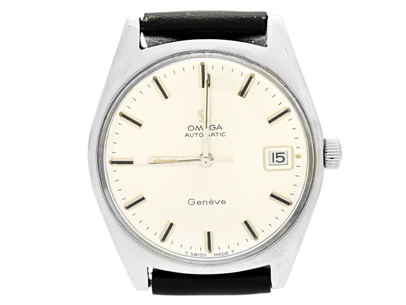 OMEGA, Genève (T Swiss Made T), Cal 565, Serie nr. 26902467, Ref nr. ST 166.041, Boett nr. 166.041 (LL), herrur, 34 mm, stål, automatisk, plexiglas, datum, skadad urtavla, skadad boett (felpolerad), läderband, ca 1969, box (skadad).