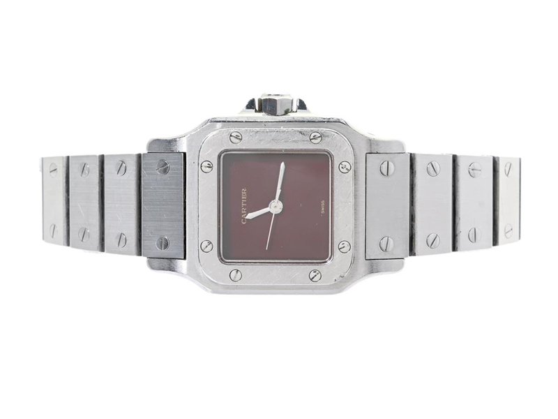 CARTIER, Santos Carrée, Cal ETA 2670, Boett nr. 090110398, damur, 24 x 24 (34,5) mm, stål, automatisk, safirglas (nagg), skadad urtavla, defekt (går ej, akut servicebehov), safir på krona saknas, integrerad originallänk, viklås, Ref nr. 151337, ca 1985, box, ytterkartong (skadad).