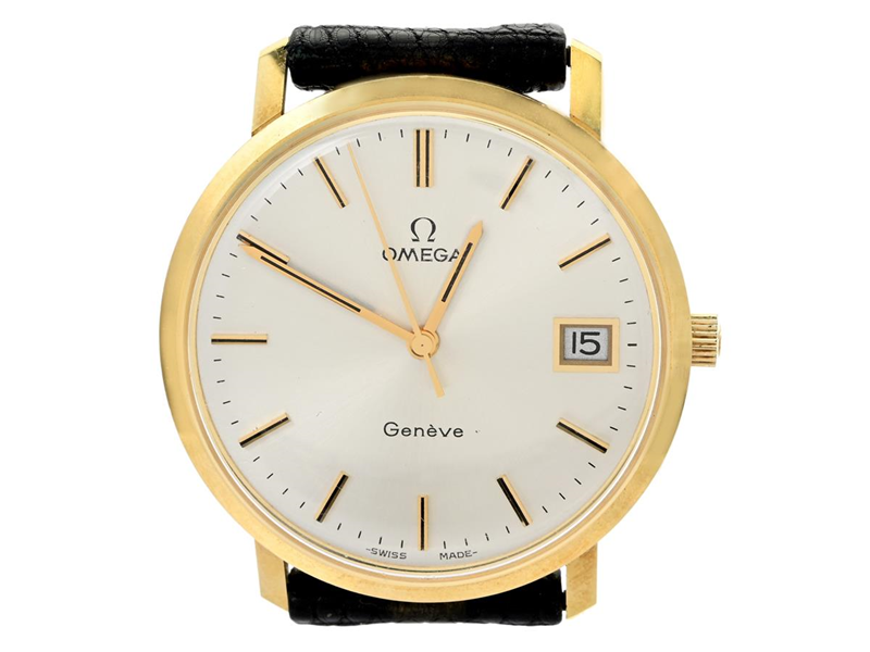 OMEGA, Genève (-Swiss Made-), Cal 1030, Serie nr. 38596267, Ref nr. BA 132.9051, Boett nr. 1181 / 1329051-1, herrur, 34 mm, 18K guld, manuell, plexiglas, datum, läderband, originalspänne i doublé, ca 1974..