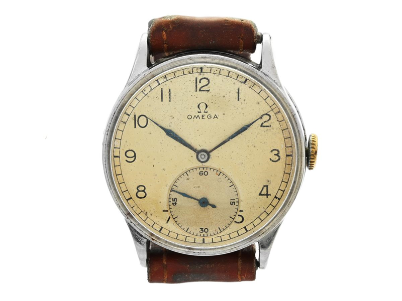 OMEGA, herrur, 32,5 mm, Cal 26,5 SOB T2, Serie nr. 8998863, Boett nr. 9728931, stål, manuell, plexiglas, liten sekundvisare, skadad urtavla, defekt (går ej, akut servicebehov), skadad boett (se bild), läderband, ca 1940.