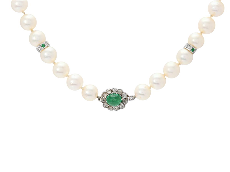 PÄRLCOLLIER, odlade saltvattenpärlor ca 7-7,5 mm, lås och mellandelar i 18K vitguld med smaragd och gammalslipade diamanter, längd ca 49 cm.