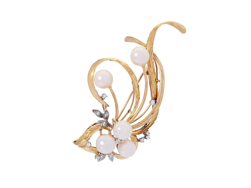 BROSCH, 14K guld, odlade saltvattenspärlor ca 2,5 - 6,0 mm, briljantslipade diamanter, höjd 55 mm, vikt 7,8 g.