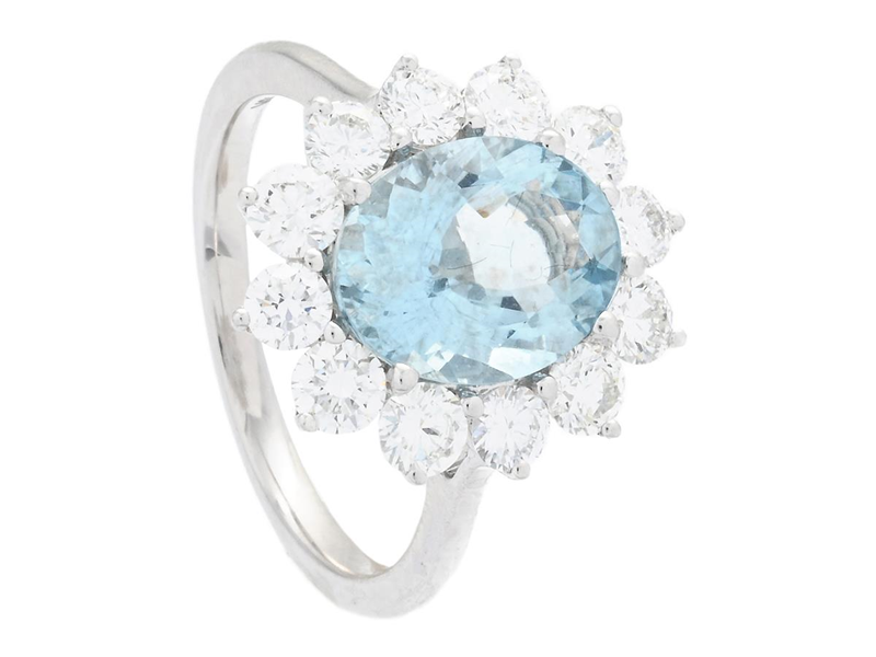 CARMOSÉRING, 18K vitguld, ovalslipad akvamarin 2,92 ct, 12 briljantslipade diamanter 1,24 ctv, ca R-TW/SI, stl 16,75 mm, vikt 3,9 g.