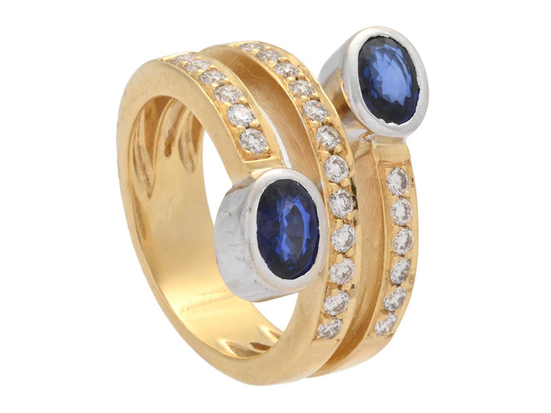 RING, 18K guld/vitguld, 2 ovalslipade safirer, 24 briljantslipade diamanter ca 0,72 ctv, ca TW/VS, stl 19 mm, vikt 15,0 g, en diamant är skadad.