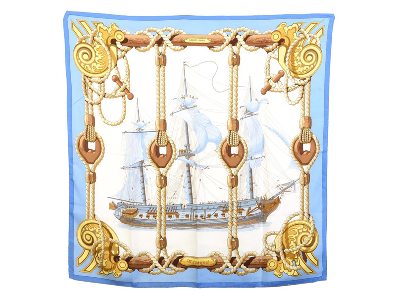 SCARF, HERMÈS, Tribord, Julie Abadie, 100% siden, ca 90x90 cm, multifärgad, blå, vit, brun, bruksslitage.