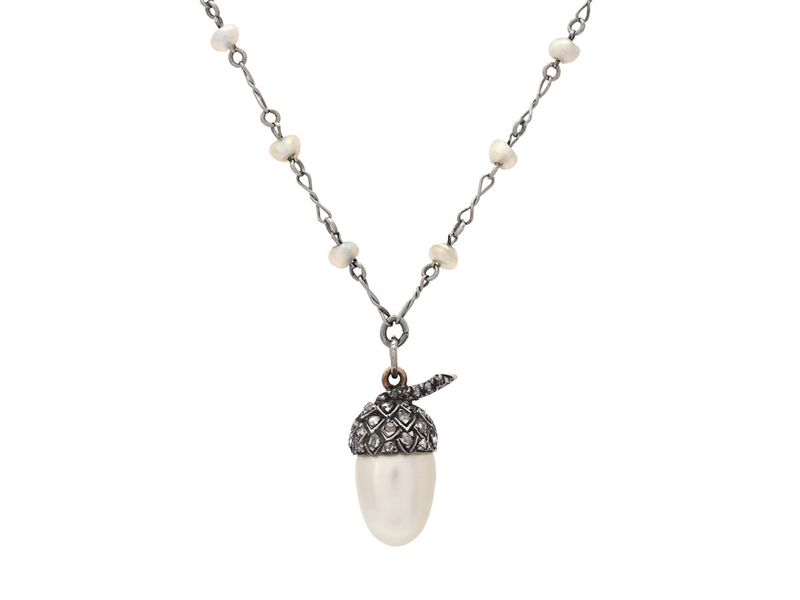 COLLIER, silver/14K guld, orientalisk pärla ca 6,8x6,8x7,5 mm, GCS report 5796-1655, rosenslipade diamanter, kedja i platina med fröpärlor, antik, längd 57 cm, hängets höjd 16 mm, vikt 4,9 g.