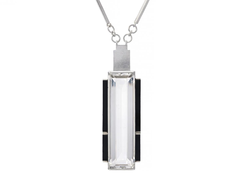 WIWEN NILSSON, collier, silver, bergkristall, onyx, signerad, Lund 1934, hängets höjd 75 mm, längd 84 cm, vikt 72,1 g, två onyx med små nagg, bergskristall med litet nagg samt något slitna fasettkanter. (d)