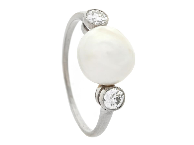 RING, platina, orientalisk pärla ca 9,4-9,8x7,4 mm, gammalslipade diamanter ca 0,40 ctv, ca TW/VS, GCS certifikat 5784-0191, stl 18,75 mm, vikt 3,6 g.