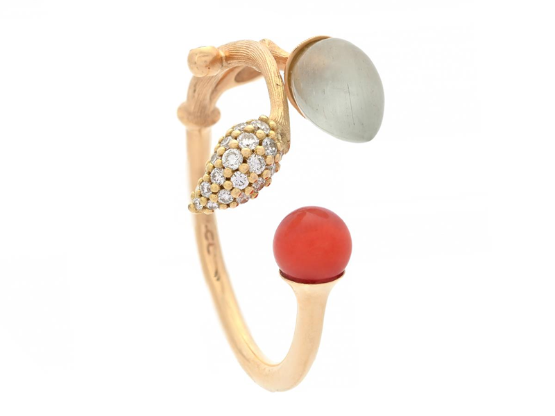 OLE LYNGGAARD, ring, Blooming, 18K guld, månsten, korall, 26 briljantslipade diamanter 0,10 ctv, stl 16,5 mm, vikt 3,0 g, originaletui.