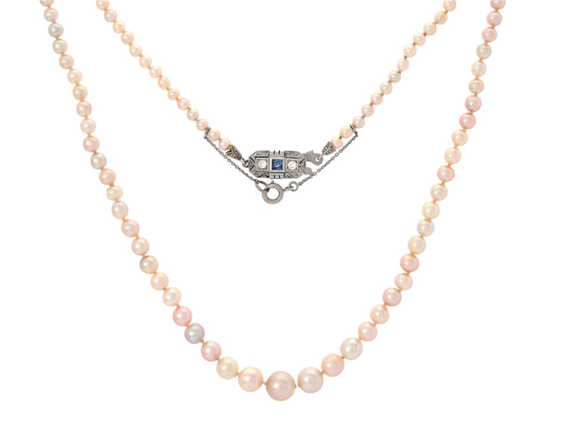PÄRLCOLLIER, orientaliska pärlor ca 3,1-7.5 mm, GCS report 5786-2389, lås i 18K vitguld med carréslipad safir ca 0,15 ct samt briljant- och rosenslipade diamanter ca 0,10 ctv, längd 44,5 cm, vikt 12,3 g, säkerhetskedja i 18K vitguld.