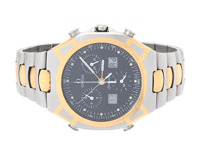 OMEGA, Seamaster, Polaris 1/100, "Olympic Games 1988", Serie nr. 50697984, Ref nr. DB 386.1232, Boett nr. 386.1232 (LL), kronograf (defekt), herrur, 37,5 mm, analog/digital, stål/guld, quartz, safirglas, ej signerat urverk, integrerad originallänk (stål/guld), viklås, Ref nr. 1455/462, längd 179 mm, ca 1988, träbox (ej komplett, skadad), ytterkartong, Limiterad och numrerad (Nr. 0505).