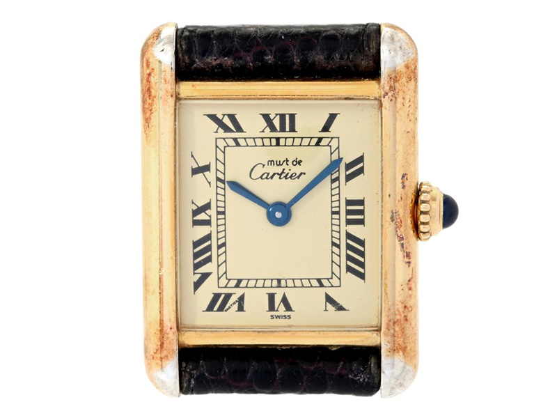 must de CARTIER, Tank, Cal 057, Boett nr. 11119 / 5057001, damur, 20,5 x 20,5 (28) mm, förgyllt silver (delvis bortnött), quartz, mineralglas, skadad urtavla, läderband, ca 1985, servicepåse.
