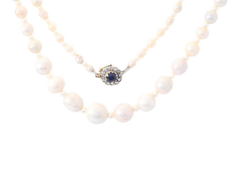 PÄRLCOLLIER, flodpärlor ca 3,2-10,6 mm och odlade pärlor ca 2,7-3,3 mm, lås i 18K guld och silver med kuddslipad safir ca 0,60 ct och rosenslipade diamanter, längd 40 cm, vikt 20,1 g, slitna klor, safiren har slitna fasettkanter, enstaka diamanter har nagg.
