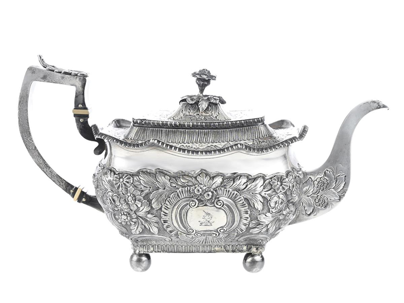 RICHARD SAWYER, tekanna, sterlingsilver, Dublin 1814, höjd 18,5 cm, vikt 747,0 g, gravyr i form av familjevapen, borttagen gravyr i botten.