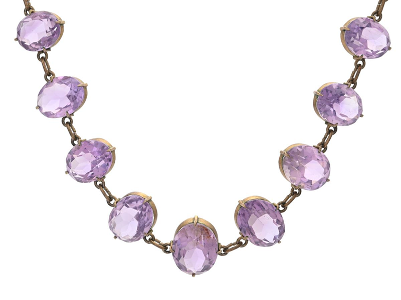 COLLIER, förgyllt silver, ovalslipade ametister ca 10x7 - 14,5 x11 mm, antik, doserad, längd 43 cm, vikt 31,3 g, vissa stenar med mindre nagg.