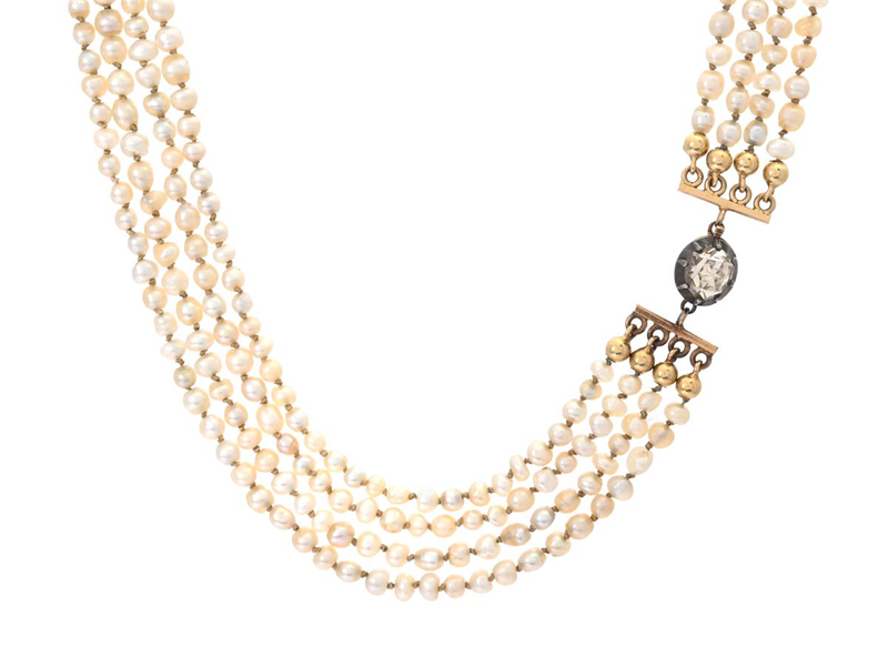 PÄRLCOLLIER, 4-radigt, orientaliska pärlor ca 2,5-3 mm, lås i 18K guld med rosenslipad diamant infattad i silver, längd 37 cm, vikt 17,7 g.