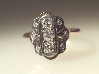 RING, 14K guld samt vitguld med 3 briljanter ca. 0.75 ct. ca. W(H)-TCR(I)/P samt 6 briljanter ca. 0.20 ct., rysk från 1945, stl 19mm