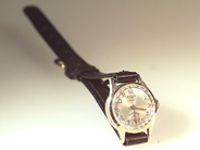 KULM, litet herrur, 26 mm, vitmetall, manuell, plexiglas, liten sekundvisare, läderband, 1940-tal.
