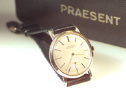 PRAESENT, herrur, 18K guld, manuell, plexiglas, liten sekundvisare, läderband, ca 1958, box.