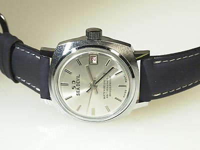 SEA DEVIL, pojkur, vitmetall, manuell, plexiglas, datum, läderband, ca 1965, oanvänd.